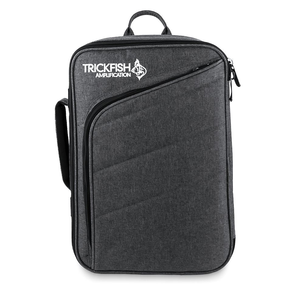 We developed this high-quality bag with the gigging bass player in mind. It features 1″ of foam padding around the amp, a durable, tear resistant outer covering, and a plush interior with a removable pad. Throw it over your shoulders as a backpack, use it as a messenger bag or carry it as a briefcase. The outer pocket is big enough for your cables, sheet music, or iPad. Also, and possibly the coolest part, it's gray with diagonal stitching and has the Trickfish logo embroidered in white!
