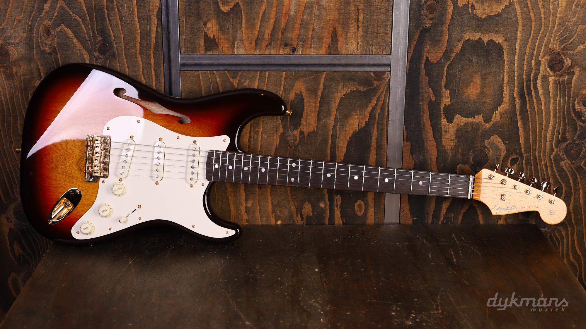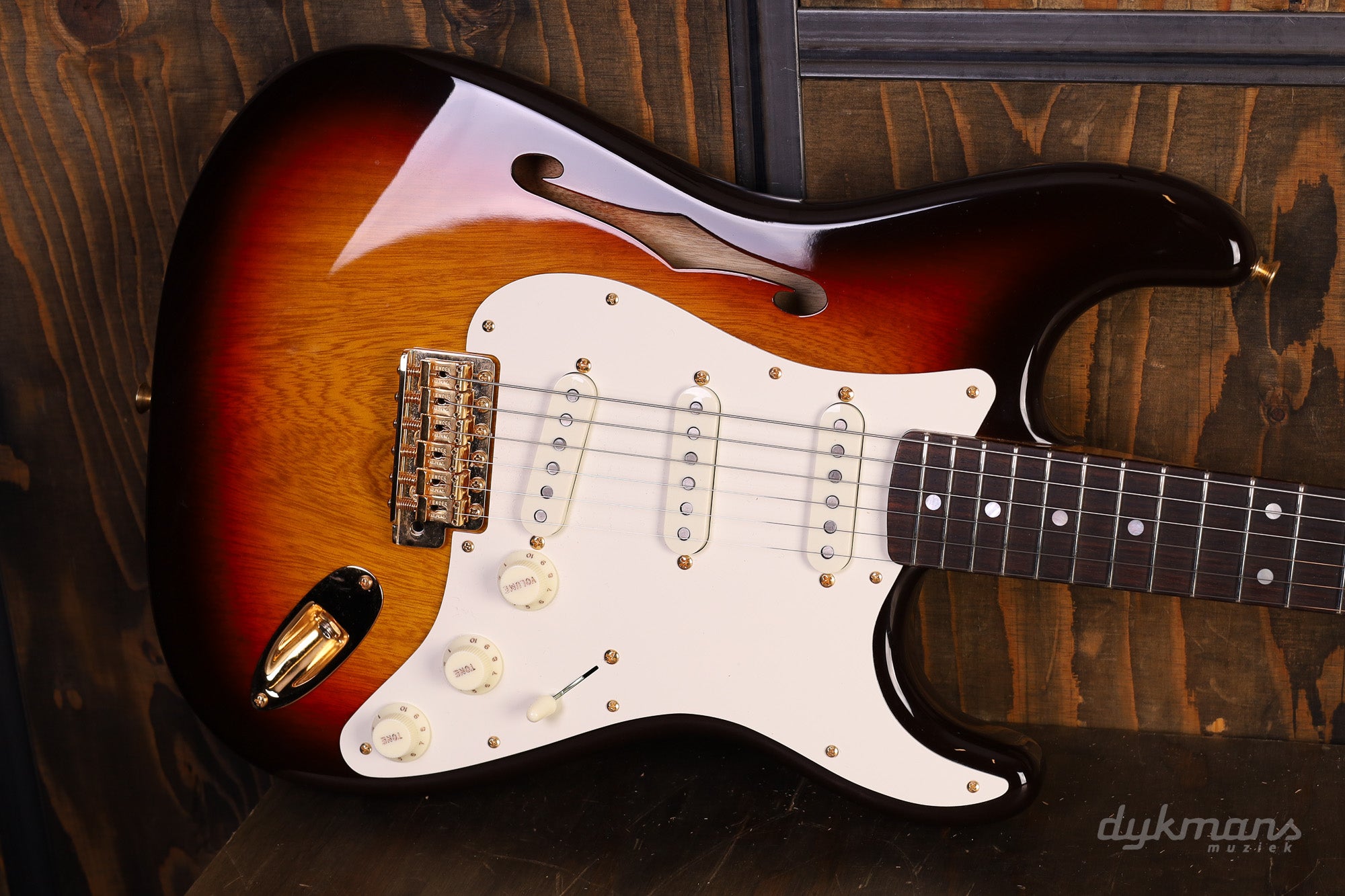 De mensuur van 25.5 inch over 21 frets geeft je die karakteristieke Strat-spanning en helderheid, terwijl de Custom Shop vintage-style bridge in goud niet alleen prachtig oogt, maar ook perfect intoneert. De Fender tuners houden alles stabiel gestemd, zelfs na intensief tremolo-gebruik.
