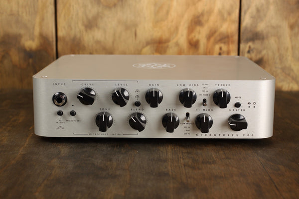 The Darkglass Electronics Microtubes 900 bass amplifier head delivers pristine tone with fast attack, while also allowing you to blend in any shade of overdrive or distortion you desire. You can engage the Microtubes Engine by either pushing the front-panel button or engaging the included footswitch for anything from a bit of grit to full meltdown. The Microtubes 900's clean section offers standard EQ controls along with switches for selecting your high- and low-mid frequencies. And the Microtubes 900 is also incredibly lightweight and portable, making it easy to gig with.