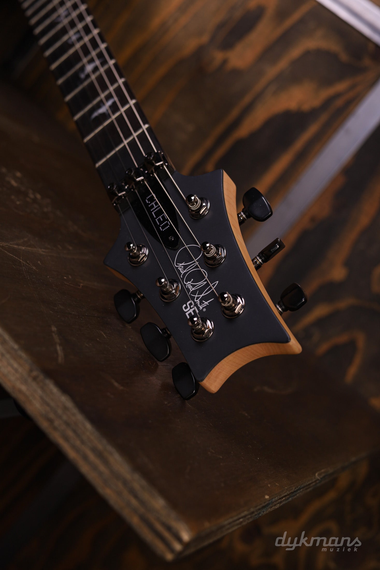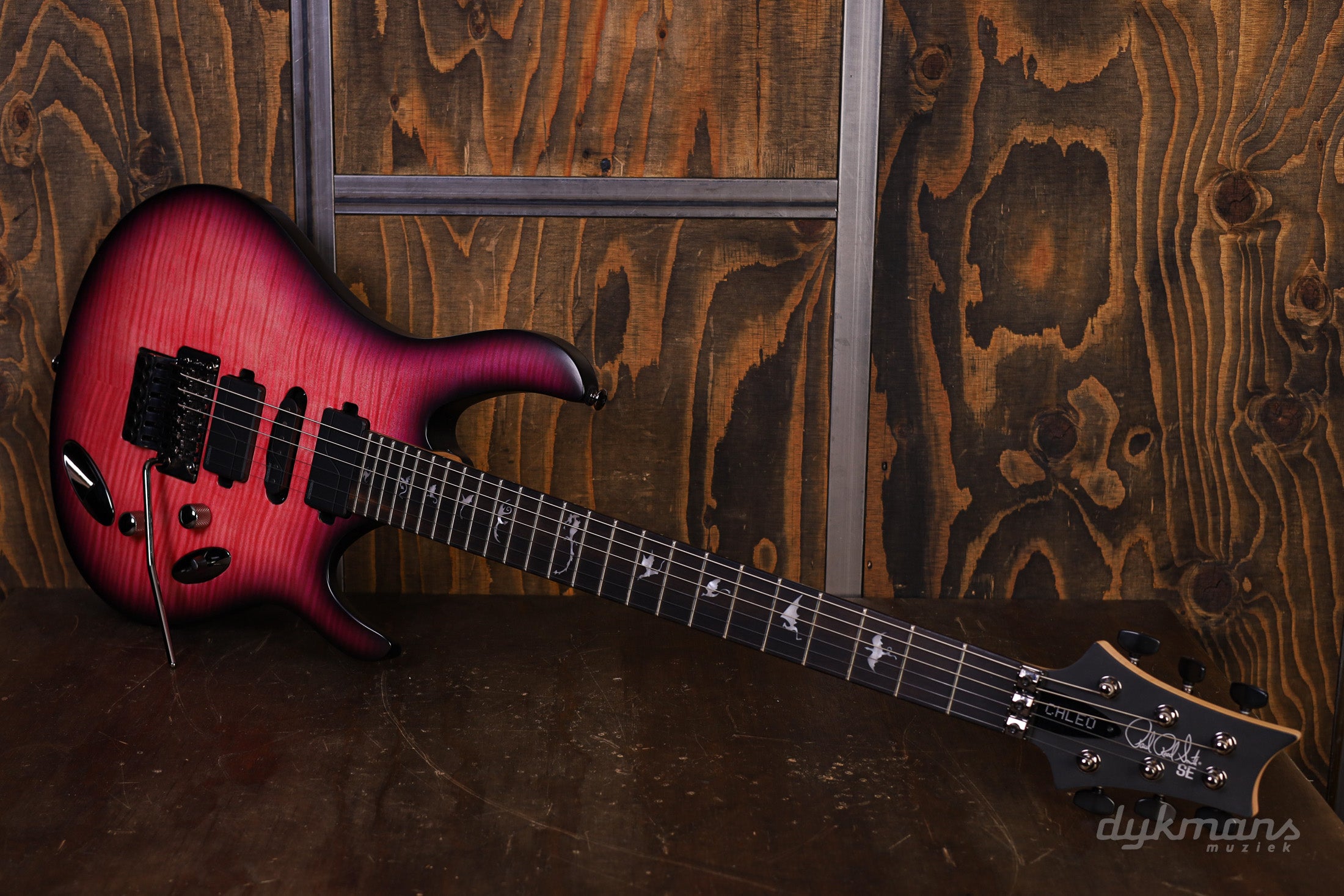 The Chleo combines a maple top with a mahogany body, maple neck, and ebony fingerboard. Thanks to its thin, lightweight body and super-fast neck, this guitar plays effortlessly—for hours. The specially shaped neck (with a 20" radius and carbon reinforcement) offers stability, sustain, and ultimate access to the highest frets. The "Eclipse Dragon" inlays and modified PRS scoop complete the package. And with the Floyd Rose tremolo, you can play at full volume without worry.